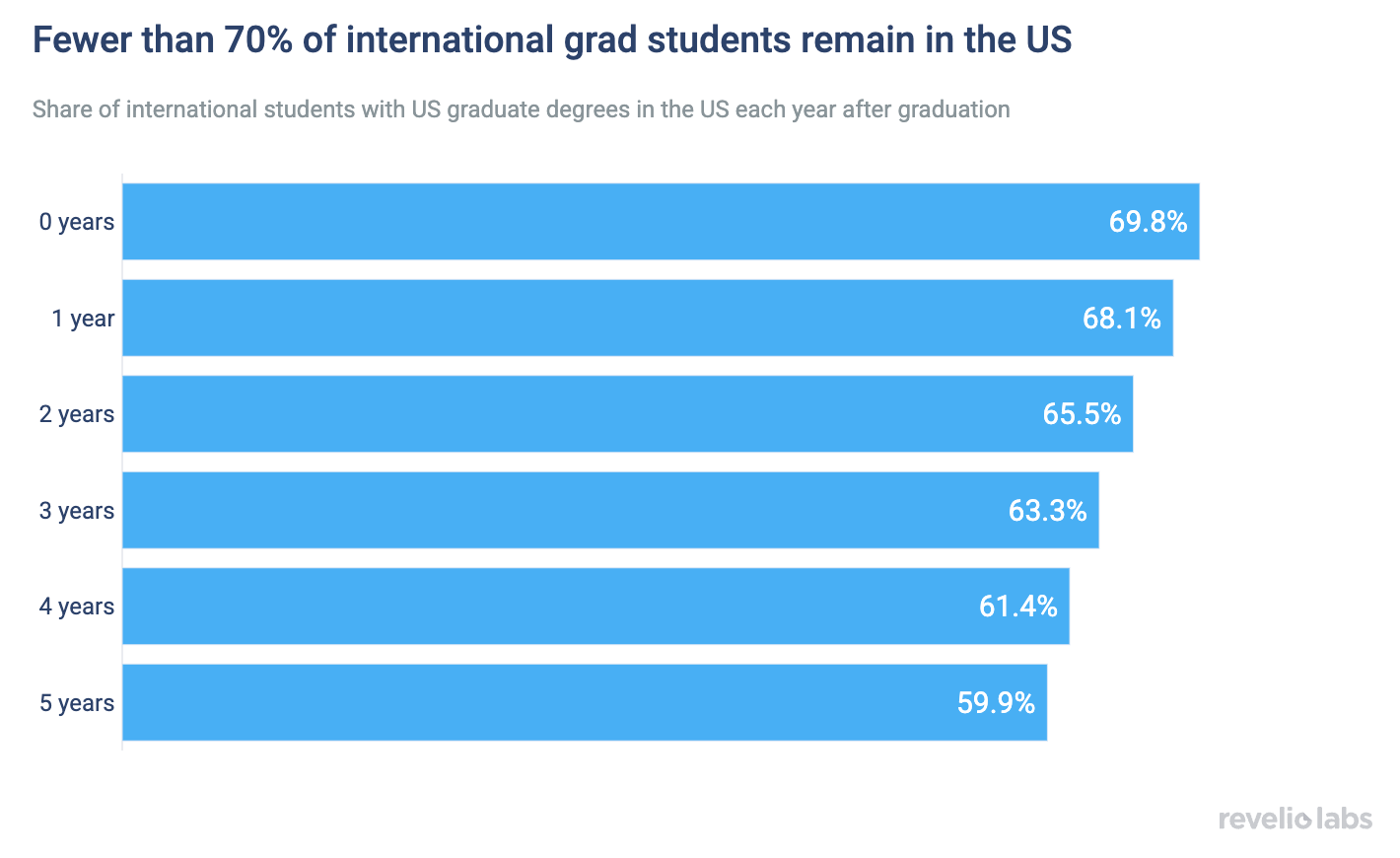 However, these students may face unique challenges in remaining in the US after their degree programs end. Most international students are on F-1 visas, which only allow students to stay temporarily for up to one year in Optional Practical Training (OPT) after finishing their degree. While certain STEM degrees have a longer OPT period, allowing students to stay for up to three years beyond graduation, a longer-term stay still requires a transition to another visa type, which can be a difficult and bureaucratic process. For instance, work visas such as the H-1B are highly competitive and in limited supply, with many applicants competing for a small number of spots. We find that more than 30% of international graduate students leave the US within the same year that they obtain their degree, and fewer than 60% remain five years after graduation. This likelihood of remaining in the US is not only relevant to the students themselves—it may also be an important consideration for US graduate programs, especially PhD programs, which invest in students through funding, training, and other resources, even though many may ultimately leave the country after graduation.
