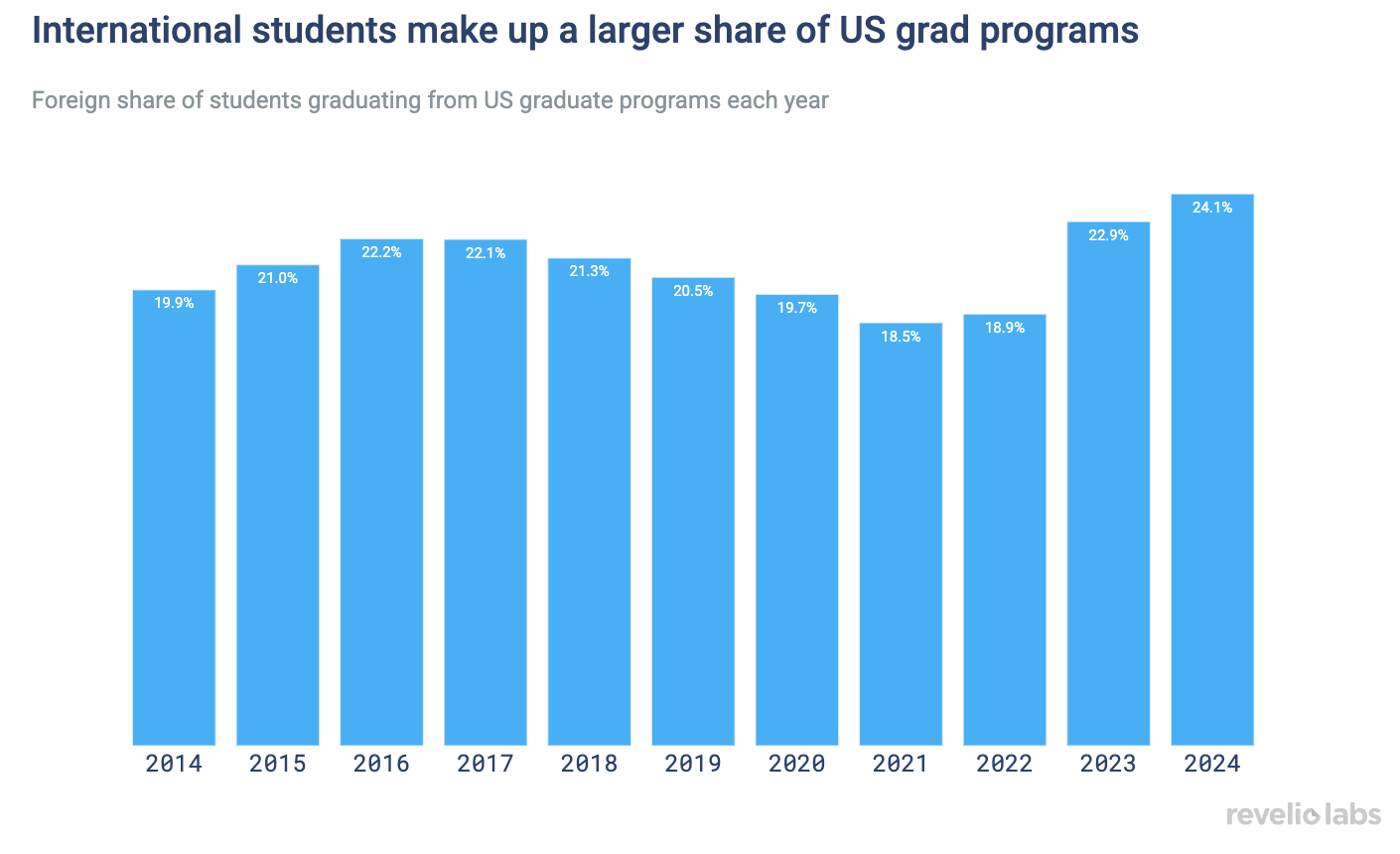 The share of foreign graduate students in the US has risen by nearly one-third over the past few years: International students made up around 18% of graduate students finishing programs in the US in 2021 and more than 24% in 2024. This reverses the decline in international share from 2017 to 2021.