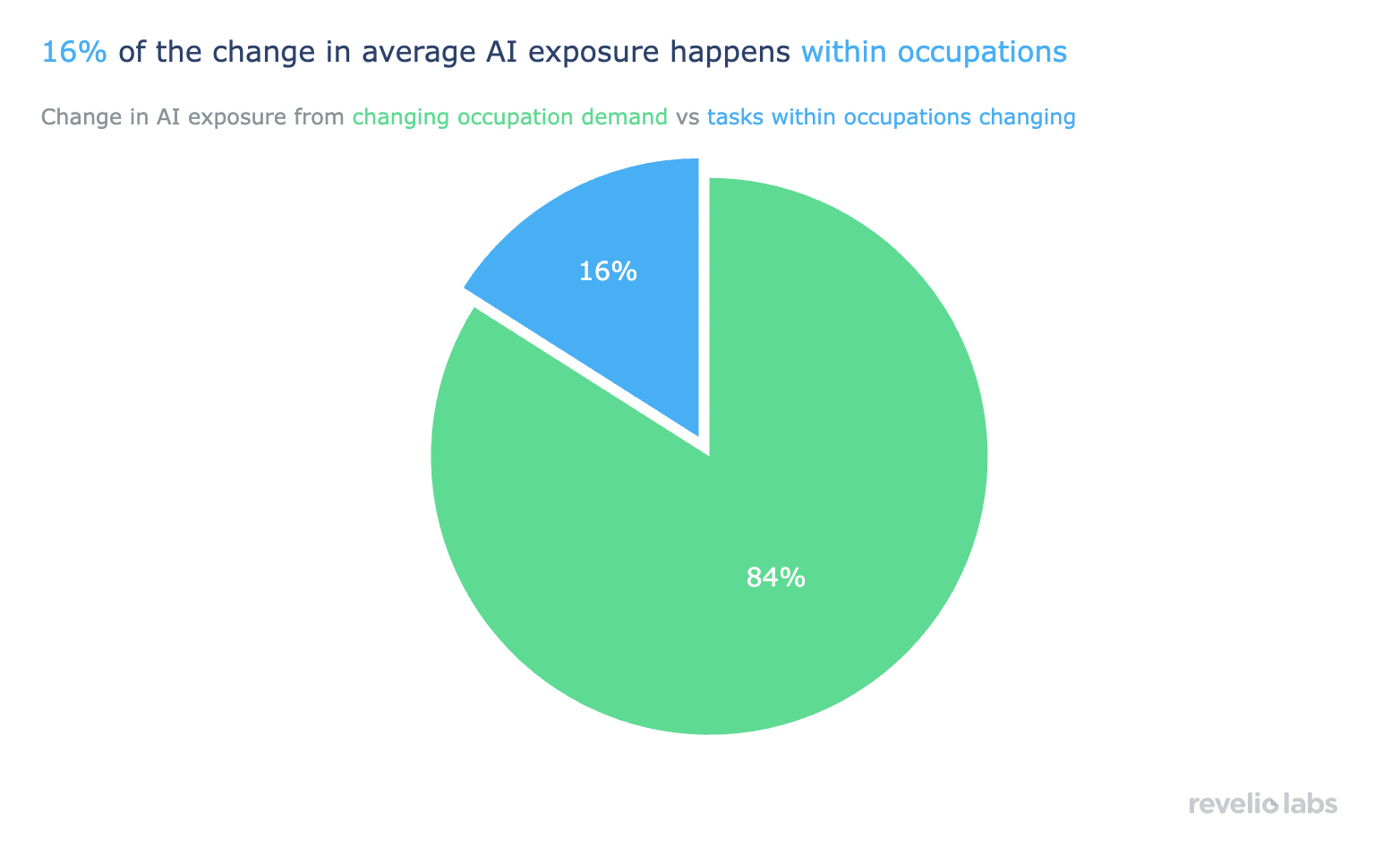 Companies aren’t just shifting which roles they hire; they’re actively trimming AI-exposed duties within the jobs they continue to fill. The decline of AI-exposed tasks within-occupation accounts for 16% of the overall decline.