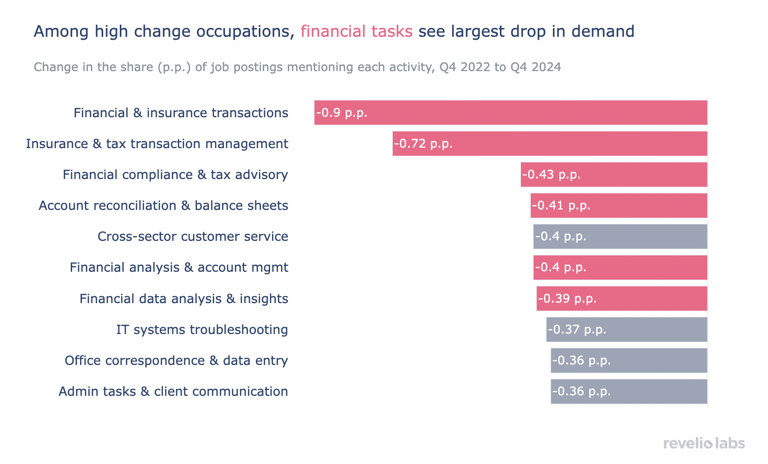 The deepest within-occupation cuts target core back-office functions: processing financial transactions and client insurance needs, managing insurance and tax transactions, financial compliance and tax advisory, and balance-sheet reconciliations.