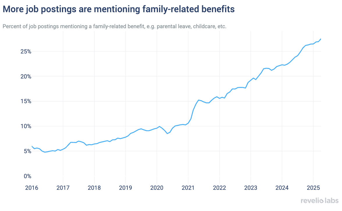 The share of job postings mentioning family-related benefits, including parental leave and childcare, has risen from about 6% in 2016 to more than 25% in 2025 as more companies are trying to appeal to working parents. However, a benefits package is not enough to make parents happy: What matters more broadly is a positive and supportive company culture.
