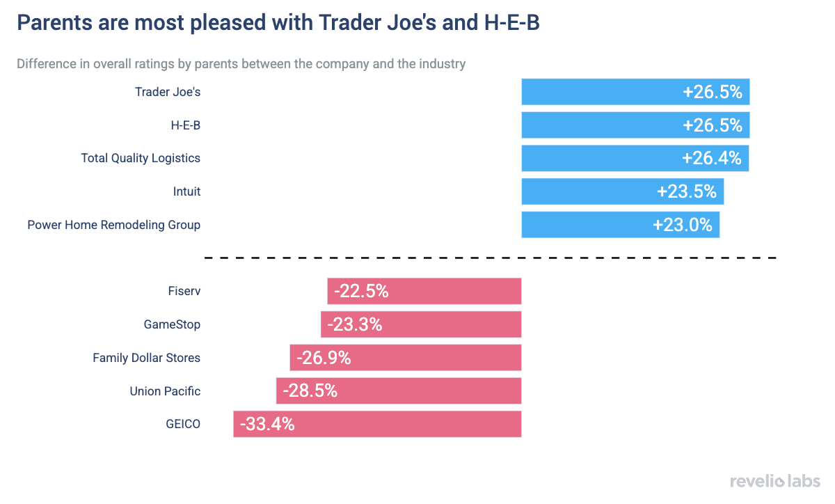 Relative to their industry, Trader Joe’s and H-E-B are parents’ favorite employers, whereas GEICO and Union Pacific are among the least liked by parents relative to their respective industries.