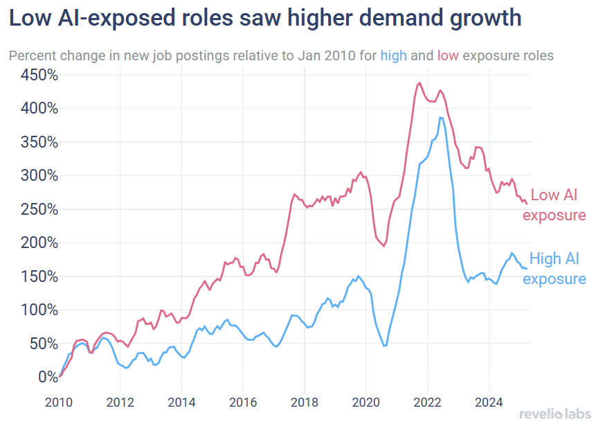 At the same time, high-exposure roles aren't becoming obsolete. In fact, it is quite the opposite. Our data shows that roles with both high AI exposure and high AI adoption have seen the fastest growth in job postings since 2010. Workers in these roles are using AI to augment their tasks and boost productivity. In contrast, those in high-exposure roles who have not adopted AI tools risk falling behind. As the productivity gap continues to widen, they may eventually be replaced by other workers who can better leverage AI to be more productive.