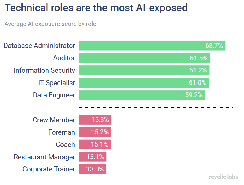 As we have shown in a previous newsletter, highly technical roles, such as database administrators, IT specialists, and auditors, are among the most exposed to AI. These roles have a high share of tasks that can be automated or augmented by AI, putting them on the front lines of this transformation. Interestingly, they also tend to be some of the highest-paying jobs. In fact, our analysis found that a 10 percentage point increase in AI exposure is associated with a 25% higher salary.